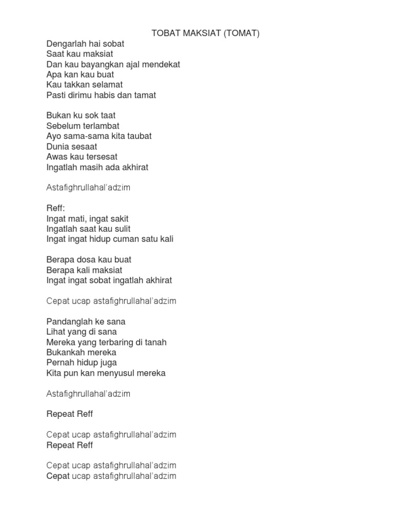 Lirik Dan Chord Lagu Tobat Maksiat Tomat Dari Wali